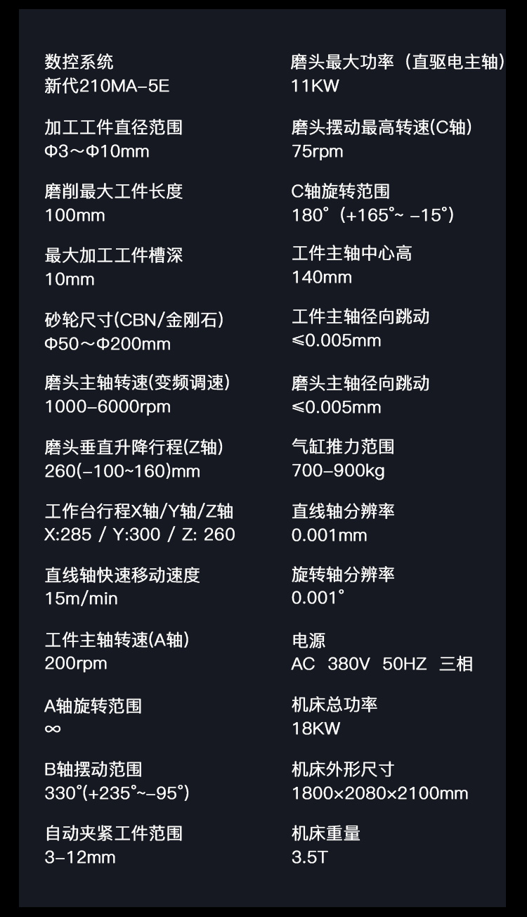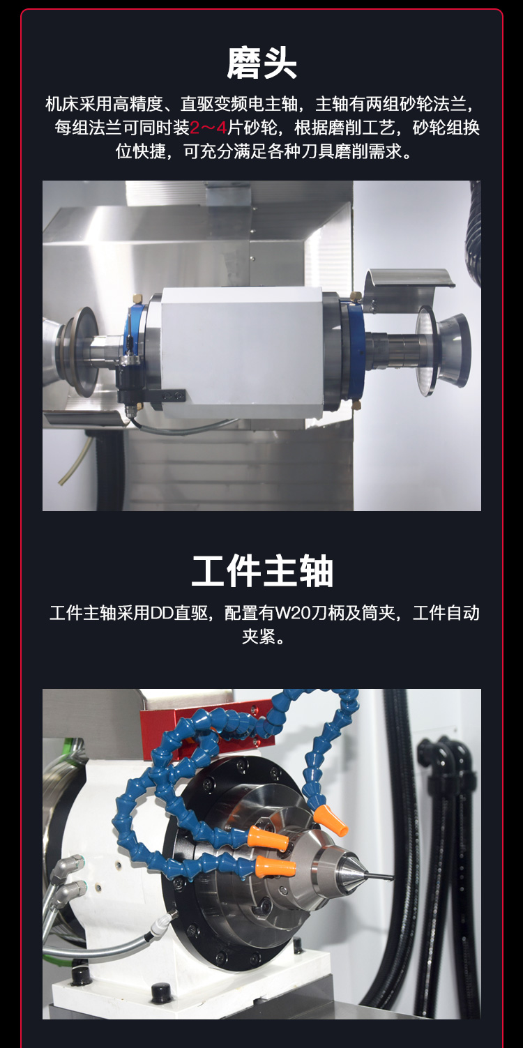 2. 機床采用高精度、直驅變頻電主軸,主軸有兩組砂輪法蘭,每組法蘭可同時(shí)裝2~4片砂輪,根據磨削工藝,砂輪組換位快捷,可充分滿(mǎn)足各種刀具磨削需求。