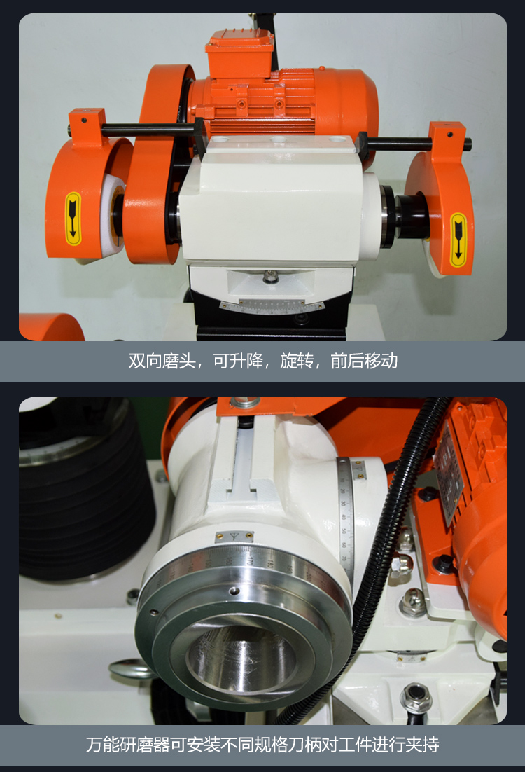 2、砂輪架構靈活,可做二度空間調整,工作頭架可做雙向回轉,并且具有標準一端NT50和一端莫氏5#錐孔,便于裝置各種刀具和夾具。
